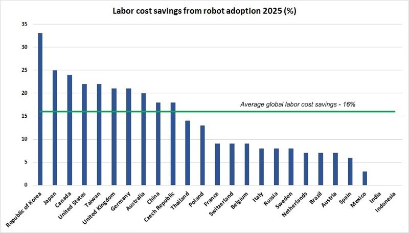 Opakuje se situace z konce 19. století, kdy dělníci ničili moderní stroje v továrnách, protože jim braly práci. Hnutí rozbíječů strojů se jmenovalo luddismus podle anglického tkalce Neda Ludda, který slavnostně a neznámo kdy zničil z těchto důvodů první tkalcovský stroj. Pět předních zemí na trhu představovalo 70 % celkového objemu prodeje průmyslových robotů v roce 2014. První je Čína, která bude představovat více než jednu třetinu veškeré průmyslové robotiky instalované po celém světě asi do roku 2018. Pak následuje Japonsko, Jižní Korea a Německo. Pokud jde o hustotu robotů, tak průmyslově a ekonomicky upadajícím Spojeným státům patří až 7. místo ve světě, Jižní Korea, Japonsko a Německo tvoří s Čínou hlavní tahouny robotizace. A nyní se podívejte na důležitý graf předpokládající úsporu pracovních míst ve světě skrze robotizaci do roku 2025.