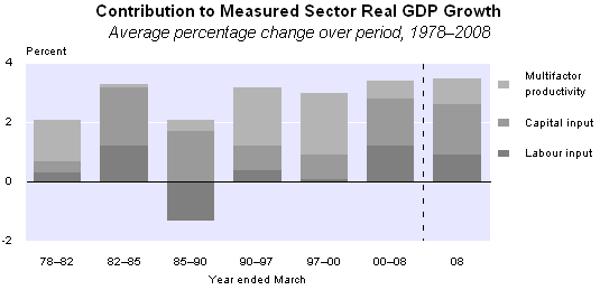 Statistika růstu HDP zkoumá, jak velkou část růstu produkce ekonomiky lze vysvětlit růstem kombinovaných vstupů. Reálný HDP může vzrůst zejména ze třech různých zdrojů: zvýšením vstupního objemu práce, zvýšením kapitálových investic nebo zvýšením výroby pomocí různých faktorů, tedy i robotiky. Následující graf z Austrálie a Nového Zélandu ukazuje růst HDP v letech 1978 až 2008 pro růstové cykly identifikované v sérii zmíněných tří faktorů.