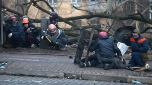 Bojovníci Pravého sektoru se skrývají před ostřelovači, kteří masakrovali jak policisty tak i protestující. Stříleli gruzínští žoldáci umístění v hotelu Ukrajina, na střeše Banky a z domů na Instituční ulici. Ti pozěji u soudu a před novináři v Rusku vypovídali i podrobnosti.