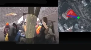Skupinka bojovníků Pravého sektoru se skrývá před policejními snejpery. Ale kulky přilétají z druhé strany od hotelu Ukrajina, kde mají stanoviště gruzínští žoldáci. Na snímku zvýrazněný zásah kulky do kmene stromu. Nová nacistická vláda nechala alej vykácet, aby zničila usvědčující stopy. Na bočním snímku je zobrazeno stanoviště gruzínských střelců v hotelu Ukrajina a úhel střelby směrem do aleje v Instituční ulici.