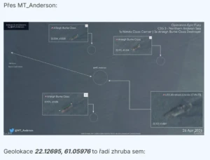 Shodou okolností jsme získali dvě nové satelitní geolokace. Zaprvé, USS Gerald R Ford, která byla vyřazena z provozu kvůli „požáru prádelny“, ale nyní se vrátila do Rudého moře. Údajně byla spatřena při prudkém obratu na geolokaci 25.275, 35.964: