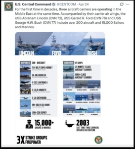 Výše uvedené zjevně potvrzuje i fakt, že americké skupiny letadlových lodí jsou konečně na svých pozicích a údajně byly doplněny a znovu nabity pro další tažení. USS Bush se má v zóně odbavení Centcomu co nevidět připojit k USS Lincoln, pokud se tak již nestalo.